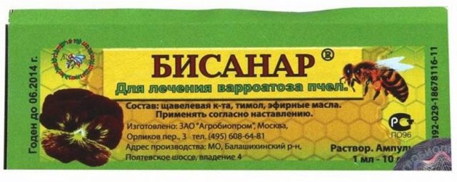 Bisanar wird verwendet, um Zecken im Herbst und Frühling loszuwerden. Vor Beginn der Behandlung werden 2 ml des Arzneimittels in 2 Litern warmem Wasser gelöst, bis sich eine transparente Suspension bildet. Das Medikament wird in eine 10-ml-Spritze gegeben und die Zwischenräume zwischen den Rahmen werden mit einer Rate von 1 Spritze pro Straße gefüllt. Nach den Bewertungen der Imker wird die Behandlung mit Bisanar zur Sublimation zweimal durchgeführt, mit einer Pause von 7 Tagen bei einer Temperatur von +10 Grad und darüber.