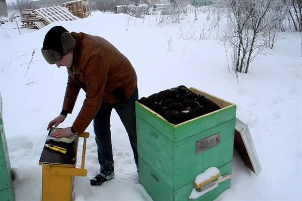 Starkes Bienengeräusch ist ein Signal zum Füttern. Um den richtigen Moment nicht zu verpassen, sollten die Bienenstöcke nach dem neuen Jahr 2-3 Mal im Monat überprüft werden. Zu diesem Zeitpunkt beginnt die Brut in den Bienenstöcken, die Temperatur im Haus steigt auf +34 Grad.