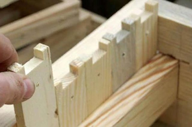 Imker machen normalerweise eine Holzschablone aus Brettern. Löcher werden in gegenüberliegende Wände geschnitten, Stangen werden eingesetzt. Sie werden eine Betonung für die gewählten Seitenstreifen der Rahmen sein. Zwischen den Stäben und den Wänden des Leiters bleibt ein Spalt. Seine Größe entspricht der Dicke des Streifens plus 1 mm für den freien Eintritt des Werkstücks.