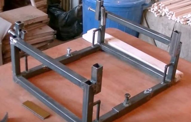 Eine Metallrahmenmaschine für Bienenstöcke wird aus einem Vierkantrohr geschweißt. Das Design ist nahezu identisch, es werden nur Schrauben zum Festklemmen der Werkstücke verwendet. Außerdem müssen keine Ösen in Seitenschienen und Stangen geschnitten werden. Am Ende der Montage des oberen Teils des Rahmens wird der Bolzen gelöst, der Mechanismus nach unten bewegt und erneut festgeklemmt. Die untere Stange wird wie ein Abstandshalter mit Kraft eingeführt. Die Elemente sind mit einem pneumatischen Bauhefter verbunden.