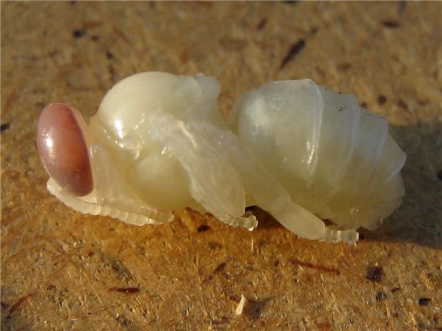 Die Larven haben eine einfache Struktur: einen kleinen Kopf, einen weißen wurmartigen Körper, der die Bauch- und Brustsegmente umfasst. Außen ist die Schale mit einer kleinen Schicht Chitin bedeckt.