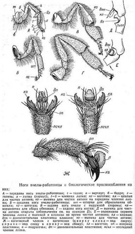 Wenn wir uns die Struktur einer Biene auf dem Bild ansehen, ist es erwähnenswert, dass sie drei Beinpaare hat, die sich alle voneinander unterscheiden. Das mittlere Paar ist am wenigsten auf Struktur spezialisiert. Jeder Fuß besteht aus folgenden Teilen: