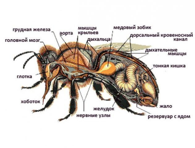 Die Besonderheit der inneren Struktur der Biene ist das Vorhandensein von Organen, mit deren Hilfe die Herstellung von Honig durchgeführt wird. Dies gilt für das Verdauungssystem des Insekts, nämlich das Vorhandensein spezieller Organe - des Honigkropfes und der Rachen-Drüse. Im Kropf speichern Insekten Nektar, und mit Hilfe von Enzymen wird der Prozess der Umwandlung von Nektar in Honig durchgeführt.