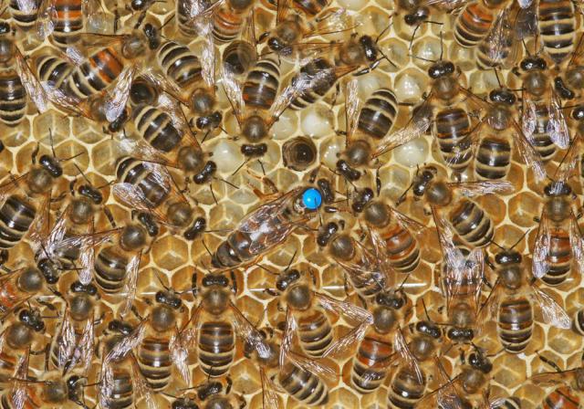 - eine Bienenkönigin unter 1 Jahr mit einer Markierung auf dem Rücken;