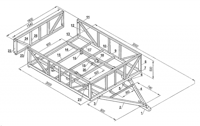 Für die Herstellung der Plattform benötigen Sie ähnliche Werkzeuge und Materialien, die für die Montage des Anhängers verwendet wurden. Die Zeichnung unterscheidet sich in der Größe. Die Plattform muss mit zwei Radsätzen mit hohen abnehmbaren Seiten ausgestattet sein. Auf Anfrage werden ein Dach und eine versenkbare Plattform hergestellt.