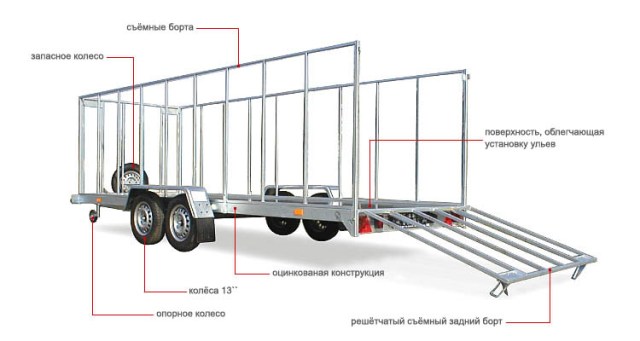 Das einfachste Gerät für den Besitzer eines nomadischen Bienenhauses ist ein Wagen zum Transport von Bienen, der an einem Auto befestigt ist. Das Fahrzeug ermöglicht den Transport einer kleinen Anzahl von Kabinen. Der Besitzer eines großen nomadischen Bienenhauses profitiert von einer geräumigen Plattform.
