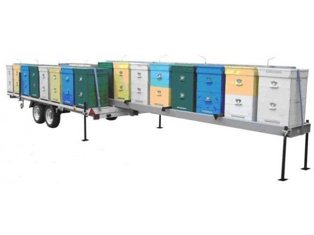 In der Tat ist die Plattform auch ein Anhänger, nur geräumiger. Das Design ist normalerweise zweiachsig. Wenn Sie in 2 Ebenen transportiert werden, können Sie bis zu 50 Bienenstöcke halten. Ein einstufiges Bienenhaus wird normalerweise nicht von der Plattform entfernt. Die Bienenstöcke sind vorhanden. Es gibt große Plattformen mit über 50 Bienenstöcken. Falls gewünscht, kann die Struktur mit einem Dach verbessert werden.