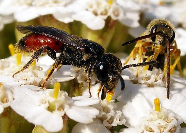 Nomada: äußerlich ähnlich wie Honigbienen, aber praktisch nicht kurz weichhaarig, haben keinen Pollensammelapparat. Ihr zweiter Name ist Kuckucksbienen: Sie bauen keine Nester, sondern brüten in den Nestern anderer Leute und leihen sich Vorräte aus.