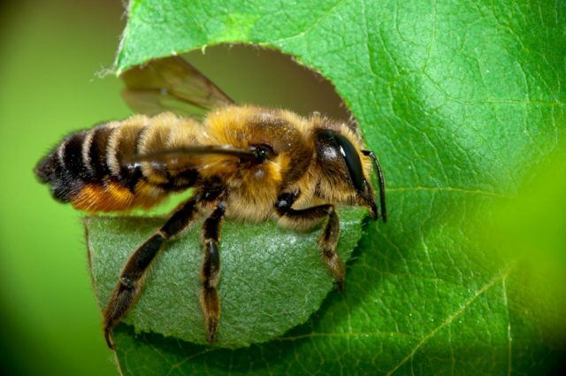Blattschneider Bienen sind Einzelgänger, die ein Nest mit Blattplatten ausrüsten. Sie haben starke Kiefer, können aber keinen Honig produzieren. Sind unter dem Schutz des Roten Buches des Stawropol-Territoriums.
