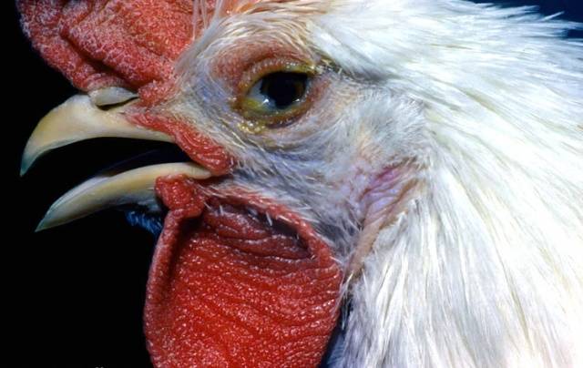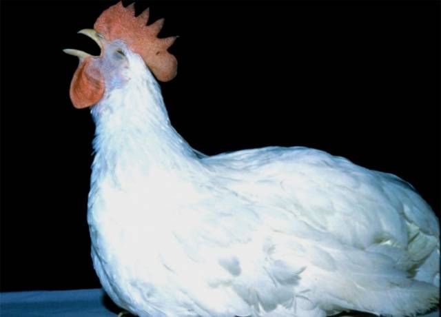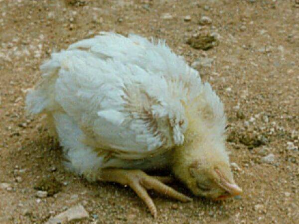 Bei der typischen Form des akuten Krankheitsverlaufs können 70% der Hühner ersticken und 88% Durchfall haben. Schnabel aus dem Schnabel, Bindehautentzündung, Appetitlosigkeit, Erhöhung der Körpertemperatur um 1-2 °. Oft liegt der Vogel mit dem Schnabel auf dem Boden und reagiert nicht auf die Umwelt.