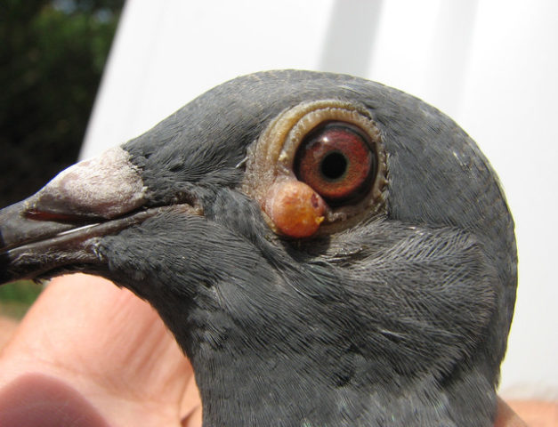 Mit einer Hautform in einer Taube können Sie Pockennarben im Schnabelbereich und auf den Augenlidern sehen. Beim Diphtheroid bilden sich Filme auf den Schleimhäuten des Nasopharynx. Filme erschweren der Taube das Atmen, was zu Keuchen führt. Der Schnabel ist offen, damit die Luft leicht in die Lunge gelangen kann.