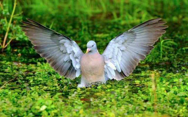 Die Wildtaube (Bild) oder Waldtaube trägt den lateinischen Namen Columba palumbus. Die Leute halten ihn für eine gewöhnliche Taube aus der städtischen Umgebung, aber die Waldtaube zeichnet sich durch große physische Daten, Farbe und das Leben in abgelegenen Gebieten aus. Die Taube lebt an nicht überfüllten Orten, versteckt sich im Laub von Bäumen und bewacht ihre "Einsiedelei". Jäger, wilde Tiere (Füchse, Frettchen, Marder, Dachs) und Greifvögel (Wanderfalke, Falke, Steinadler) sind die Hauptfeinde.