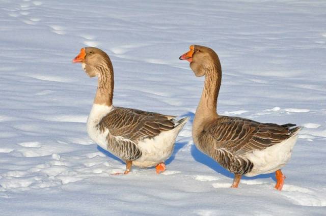Die Farbe der Kholmogory-Gänse kann grau, weiß oder grau-scheckig sein.