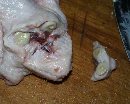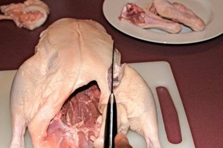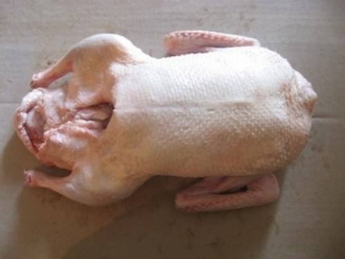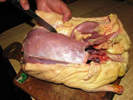 - Die Pfote der Ente bricht am Gelenk. Die restlichen Sehnen werden mit einem Messer geschnitten. Sie machen dasselbe mit der zweiten Pfote;