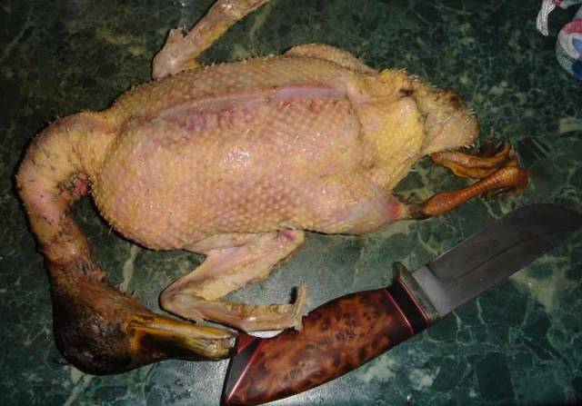 Nachdem die Ente ausgeweidet ist, entscheiden wir, ob es notwendig ist, sie zu häuten.