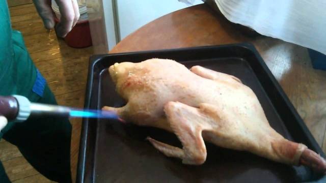 Da es weder manuell noch mit Hilfe einer Maschine möglich ist, eine Ente vollständig sauber zu zupfen, muss der Entenkadaver nach dem Zupfen versengt werden. Die Ente wird entweder mit einer Lötlampe oder auf einer Gasfackel versengt.Im letzteren Fall müssen Sie den Entenkadaver an den Pfoten und Flügeln halten. Beim Singen mit einer Lötlampe kann die Ente einfach an etwas aufgehängt werden.