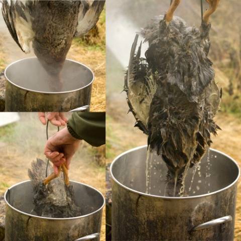 Nach dem Schlachten wird die Ente in einen Behälter mit kochendem Wasser gegeben. Normalerweise hat jeder Entenbesitzer seine eigenen Geheimnisse, einen Entenkadaver "einzuweichen" und ihn dann zu zupfen. Ein Weg: Tauchen Sie den Entenkadaver zweimal in kochendes Wasser. Dies funktioniert gut, wenn eine alte Ente gezupft wird.