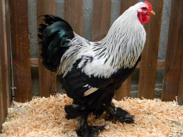 Die Farbe des Hahns des dunklen Zweigs der Brama-Rasse wird auch als silberschwarz bezeichnet. Kopf und Hals des Hahns sind mit einer leichten Feder mit schwarzen Längsstreifen bedeckt. Auf den Schultern, dem Rücken und dem unteren Rücken ist die Abdeckfeder ebenfalls leicht. Am unteren Rücken folgt die Farbe der langen Federn der Farbe der Feder in der Mähne.