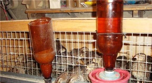 Gleiches gilt für Trinker. Tatsache ist, dass die Marmorwachtel wie andere einheimische Verwandte nur sauberes Wasser verbrauchen sollte. Die geringste Verschmutzung kann Darmkrankheiten verursachen. Und es ist nicht immer möglich, das Wasser in einer normalen Schüssel rechtzeitig zu wechseln. Trinkschalen aus Plastikflaschen reichen aus, wie auf dem Foto.