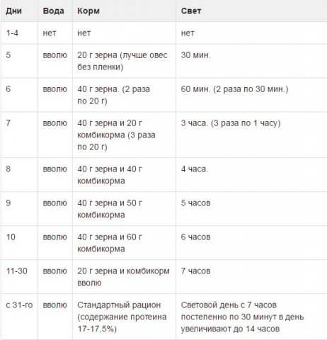 Die Mauserzeit in Schichten kann verkürzt werden, indem den Hühnern ein hochwertiges Futter mit erhöhten Methionin- und Cystinwerten zur Verfügung gestellt wird. Der Gehalt dieser Substanzen im Futter für Legehennen sollte 0,6-0,7% betragen. Diese Aminosäuren sind in tierischen Nahrungsergänzungsmitteln und Abfällen aus der Sonnenblumenölproduktion enthalten: