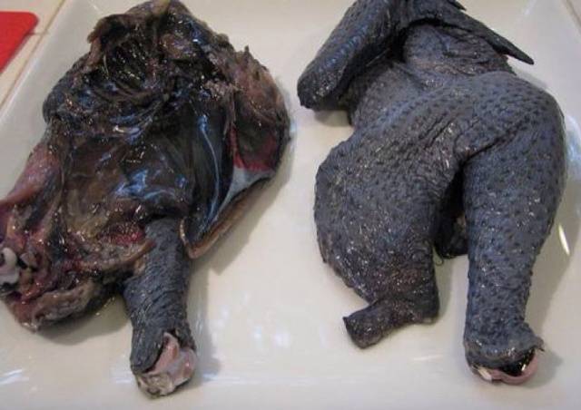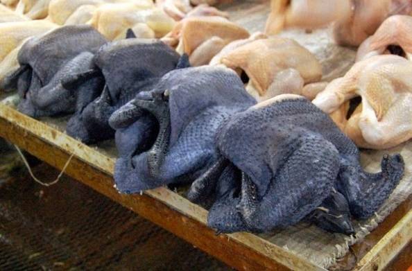 Seidenhühner werden im industriellen Maßstab gezüchtet, sie vermehren sich gut. Aber nur ihre Haut ist schwarz. Sogar auf diesem Foto können Sie das weiße Fleisch sehen, das durchscheint. Ein echter Kadaver der Hühnerrasse Ayam Tsemani auf dem Foto unten.