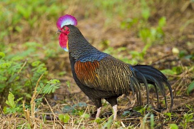 Sein Vorfahr von der Seite der Hähne ist eine grüne Dschungelhenne.