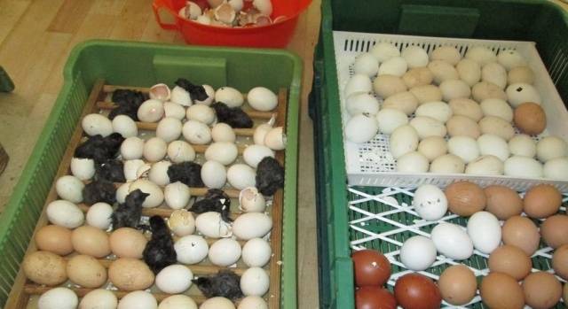Nach 3 Wochen Inkubation schlüpfen vollständig schwarze Küken mit grauen Brüsten aus den beigen Eiern. Sie werden später komplett schwarz.