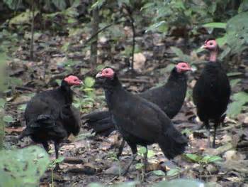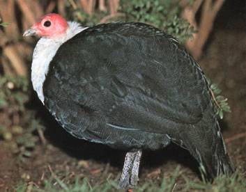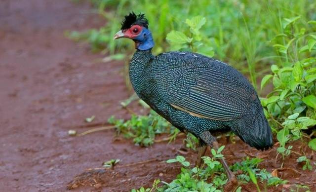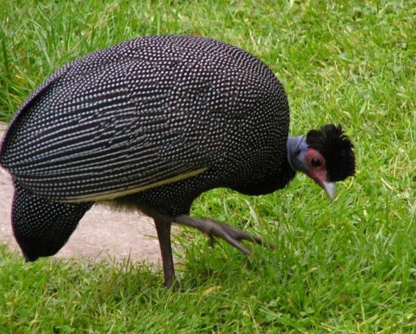 Es sieht ein bisschen wie das Haus aus, hat aber ein dunkles Gefieder und eine glatte, nackte Haut an Kopf und Hals. Anstelle eines Auswuchskamms befinden sich auf dem Kopf eines Perlhuhns mit Haube Federn, die einem Kamm in einem Hahn ähneln. Der Vogel lebt in Zentralafrika im Primärwald. Verhalten und Lebensstil werden schlecht verstanden. Nicht domestiziert.