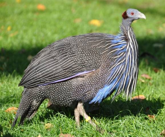 Das Foto vermittelt nicht die ganze Schönheit des Gefieders dieser Rasse. In Wirklichkeit hat der Vogel eine wirklich blaue Feder mit kleinen weißen Flecken. Während der Bewegung bewegen sich die Federn und das Perlhuhn schimmert mit einem Perlenglanz. Dies ist die schönste Rasse von allen. Und es lohnt sich, es nicht einmal für Fleisch zu beginnen, sondern für die Dekoration des Hofes.