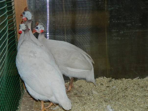 Ohne die dunklen Augen und die rote Farbe der Ohrringe könnten die Vögel sicher als Albinos registriert werden. Sie haben weißes Gefieder, leichte Schnäbel und Pfoten, weiße und rosa Kadaver. Diese Farbe ist kommerziell rentabler als die dunkle, da dunkle Kadaver unappetitlich aussehen und nicht jeder es wagt, ein "schwarzes Huhn" zu kaufen. Das weiße Perlhuhn ist ästhetisch viel attraktiver.