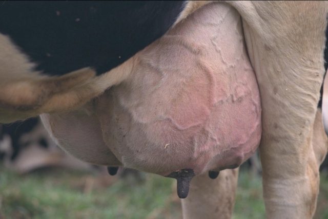 Gleichzeitig summt die Kuh, lässt das Euter nicht berühren, humpelt oft an den Hinterbeinen, legt sich lieber hin, steht schwer auf.