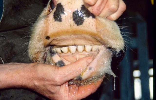 Mit der Entwicklung einer Nekrobakteriose bei Rindern leiden Mund, Nase, Zunge, Zahnfleisch und Kehlkopf an den Schleimhäuten. Bei der Untersuchung sind Nekroseherde und Geschwüre sichtbar. Infizierte Personen haben einen erhöhten Speichelfluss.