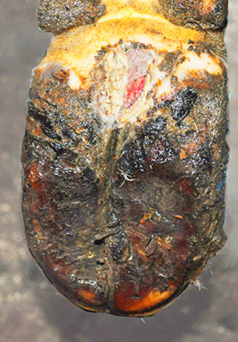 Bei einer Nekrobakteriose der Extremitäten (Foto) nimmt ein Rinder die Beine unter sich auf und humpelt. Die Untersuchung der Hufe zeigt Schwellung, Rötung und eitrigen Ausfluss. Im ersten Stadium der Krankheit hat die Nekrose klare Grenzen, dann dehnen sich die Läsionen aus, es bilden sich Fisteln und Geschwüre. Beim Abtasten treten starke Schmerzen auf.