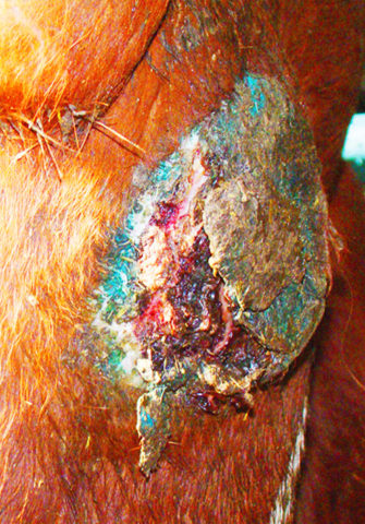 Die Haut ist am häufigsten im Nacken, in den Gliedmaßen über den Hufen und in den Genitalien betroffen. Es manifestiert sich in Form von Geschwüren und Abszessen.