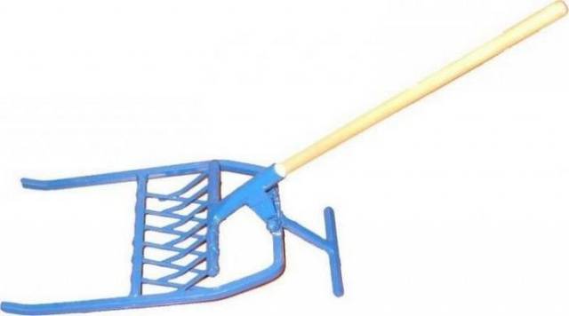 Der Rahmen selbst besteht aus einem Hohlrohr. Dies stellt die Leichtigkeit des Werkzeugs sicher. Die Zähne bestehen aus gehärtetem Stahl. Um das Wunder zu wirken, wird die Schaufel auf einen Holzgriff gelegt.