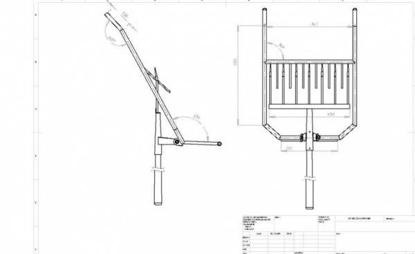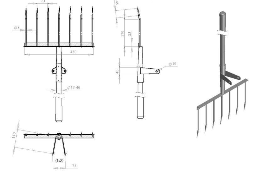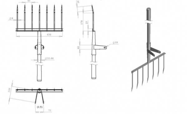 Aus der Zeichnung ist ersichtlich, dass das Gerät eine Wunderschaufel ist, die einfach ist. Darüber hinaus stellt es keine Gefahr für eine Person dar, die während der Arbeit verletzt wird. Der Arbeitsteil ist eine breite Heugabel. Sie sind mit zwei Anschlägen am gemeinsamen Rahmen befestigt, um die Mobilität des Elements zu gewährleisten. Die Zähne sind innen mit dem stationären Rahmen verschweißt. Eine Betonung von zwei Elementen wird vor gemacht. Es ist eine Erweiterung des Rahmens. Das Backgauge des Pflügers hat die Form des Buchstabens T.