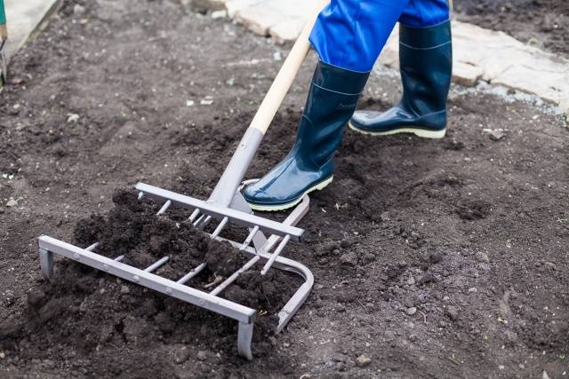 Bei der Bodenbearbeitung müssen Sie nach der Verwendung einer Bajonettschaufel Klumpen aufbrechen und den Boden mit einem Rechen ausgleichen. Nach dem Durchgang des Pflügers steht ein Beet zum Pflanzen bereit. Das Werkzeug kann sogar schnell einen kleinen Garten zum Pflanzen von Kartoffeln ausgraben.