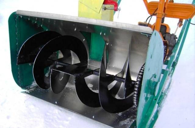 Das effektivste hausgemachte Schneefräse Für das Haus mit Ihren eigenen Händen wird es sich herausstellen, wenn Sie es mit einem Schraubenmechanismus ausstatten. Fast alle werkseitig gebauten Schneefräsen haben ein ähnliches Design. Das Funktionsprinzip der Ausrüstung besteht darin, Schnee mit rotierenden Spiralmessern zu erfassen. Die Schneefräse besteht aus zwei seitlichen Spiralen, zwischen denen Metallklingen in der Mitte der Welle angeschweißt sind. Sie werfen Schnee in den Entladearm. Die Schneefräse ist über einen Riemenantrieb mit der Traktionseinheit selbst verbunden.