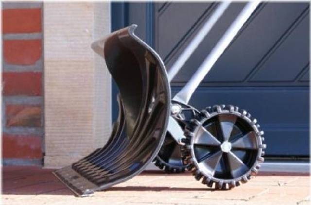 Wenn Sie mit einem Schaber arbeiten, müssen Sie keinen Schnee werfen, er wird einfach in die richtige Richtung geschoben. Ein solches Werkzeug wird in kleinen und ziemlich großen Bereichen eingesetzt. Um ihre Arbeit zu erleichtern, verwenden viele Sommerbewohner zusätzliche Läufer oder Räder.