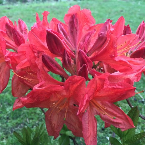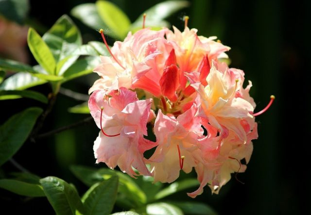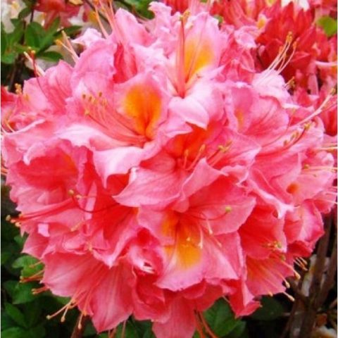 Blumen haben einen Duft, 7-10 Stücke bilden sich im Blütenstand. Der Durchmesser der Blume beträgt 6-8 cm. Die Blüten des japanischen Laub-Rhododendrons sind Lachse mit hellen, orangefarbenen und roten Farbtönen. Es wächst im Halbschatten und in der Sonne um 20-25 cm pro Jahr.