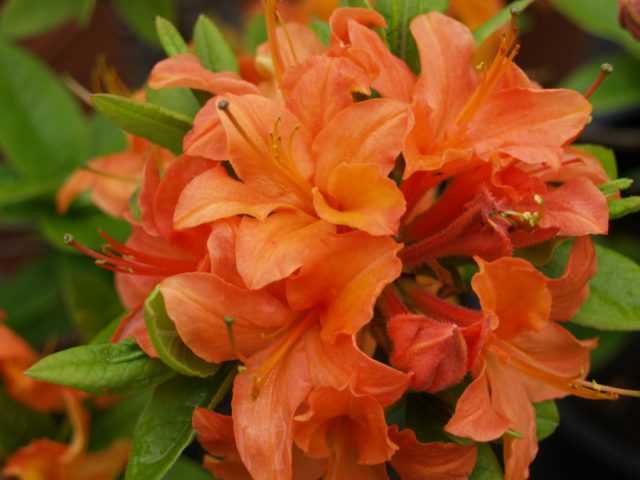 Einer der leuchtenden, wunderschön blühenden orangefarbenen Laub-Rhododendren. Der Busch breitet sich aus, wächst dicht und erreicht eine Höhe und Breite von 1,5 bis 2 m. Mit einer durchschnittlichen Wachstumsrate. Die Blätter sind zu Beginn der Saison dunkelgrün. Später werden sie purpurrot mit einem Übergang zu orange-gelb.