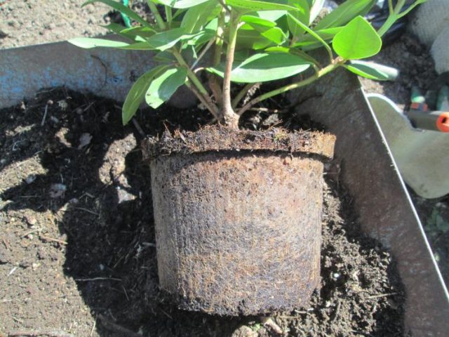 Das Wurzelsystem des Rhododendrons ist faserig und erweitert sich in der Breite. Daher wird ein großes Loch zum Pflanzen vorbereitet, das um ein Vielfaches breiter als die Größe des Sämlings ist. Die Grube ist mit einem sauren Substrat gefüllt. Dazu werden dem aus der Grube entnommenen Gartenboden Bestandteile hinzugefügt, die eine Säurereaktion hervorrufen: roter Hochmoor-Torf, Kiefernstreu.