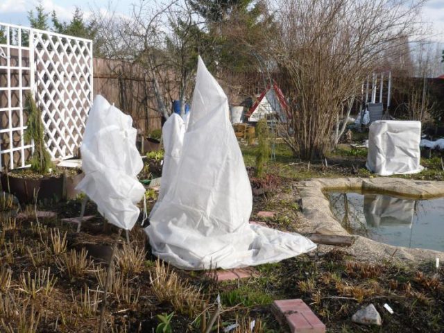 Für einen lufttrockenen Unterstand wird ein Rahmen aus Brettern oder Bögen konstruiert und mit Spinnvlies bedeckt. Das Tierheim sollte klar und nicht in der Nähe von Ästen sein. Am Boden der Struktur bleibt ein Spalt für den Luftdurchgang. Plastikfolie, insbesondere von dunkler Farbe, wird nicht verwendet, um keine Überhitzung und Verrottung des Busches hervorzurufen.