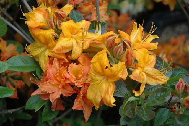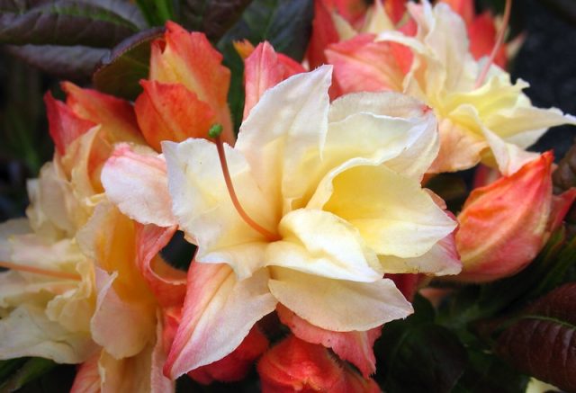 Sorten von Laubazaleen haben eine große Auswahl an leuchtenden Farben und Kombinationen. Charakteristisch sind Lachs-, Gelb-, Orange-, Beige- und Rottöne.
