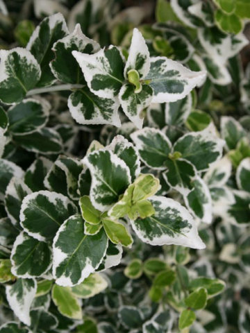 Fortunes Eonymus "Emerald Gaiety" ist eine der beliebtesten Sorten. Verteilt in Regionen mit gemäßigtem Klima. Die frostbeständigsten Arten von Euonymus. Im Gegensatz zu anderen Arten hört es nicht auf, in schattigen Bereichen auf der Nordseite zu wachsen. Ein immergrüner Strauch wirft für den Winter kein Laub ab, sondern ändert nur seine Farbpalette.