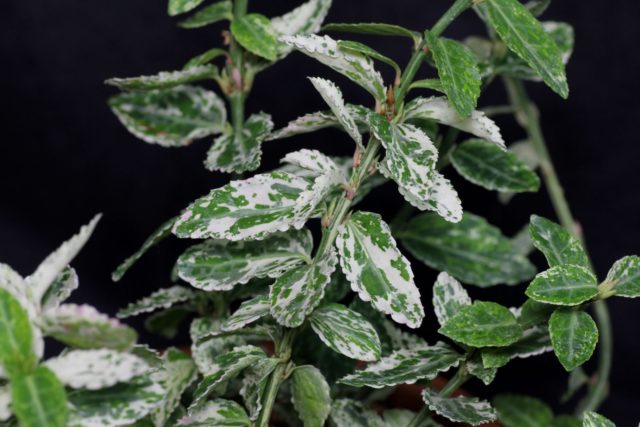 Das Vermögen wird durch eine große Anzahl dünner krautiger Triebe gebildet, die reichlich belaubt sind. Das dekorative Aussehen der Pflanze wird durch hellgrüne, ovale Blätter auf der Oberfläche mit Fragmenten von Flecken von Weiß-, Beige- und Gelbtönen gegeben. Im Herbst färben sich die Blätter hellrosa.