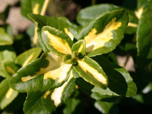 Euonymus Sunspot Euonymus Sunspot ist eine niedrig wachsende Kriechpflanze mit einer Höhe von 25 cm. Die Triebe sind etwa 1,2 m groß. Kleine Blätter an den Trieben sind dicht angeordnet und bilden eine üppige kugelförmige Krone. Die Sorte wächst schnell (30 cm pro Jahr), ist frostbeständig und benötigt keine Beleuchtung. Die schattierte Stelle beeinflusst die dekorative Wirkung des Strauchs nicht.
