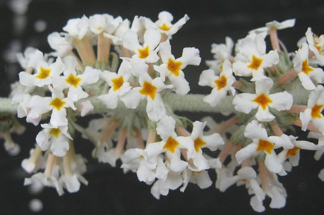 Budleia Brache blüht vom Spätsommer bis zum Herbst, die Pflanze produziert lavendelblaue oder weiße, flauschige Blütenstände an den Spitzen junger Triebe. Die Art hat eine durchschnittliche Winterhärte und die Pflanze verträgt Frost gut, aber in Russland ist sie weniger beliebt als Buddleya und David.