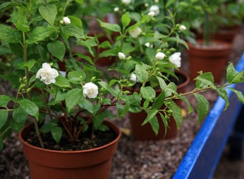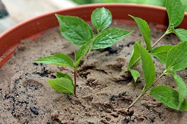 Junge Setzlinge wachsen bis zum Herbst aus Sommertrieben von Gartenjasmin. Zum Wurzeln muss der Boden in einem Gewächshaus mit Sämlingen ständig feucht sein.