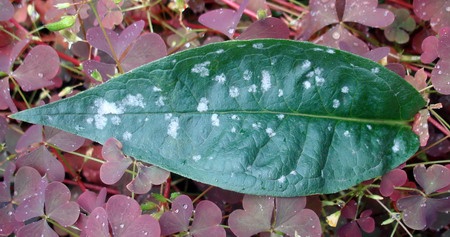Die ersten Anzeichen einer Infektion sind weißliche Flecken, die zuerst an den unteren Zweigen und Blättern auftreten. Diese Flecken breiten sich sehr schnell in der Pflanze aus und heben ihre dekorative Wirkung auf. Wenn die Krankheit beginnt, erscheinen transparente Tropfen auf den Flecken, die die Grundlage für den Namen des Pilzes bildeten. Letztendlich trocknet die Infektion den Busch aus, was zur Beendigung der Blüte und zum frühen Tod der Pflanze führt.